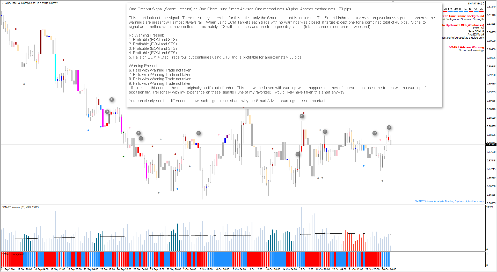 One Catalyst Signal (Smart Upthrust) on One Chart Using Smart Advisor. One method nets 40 pips. Another method nets 173 pips